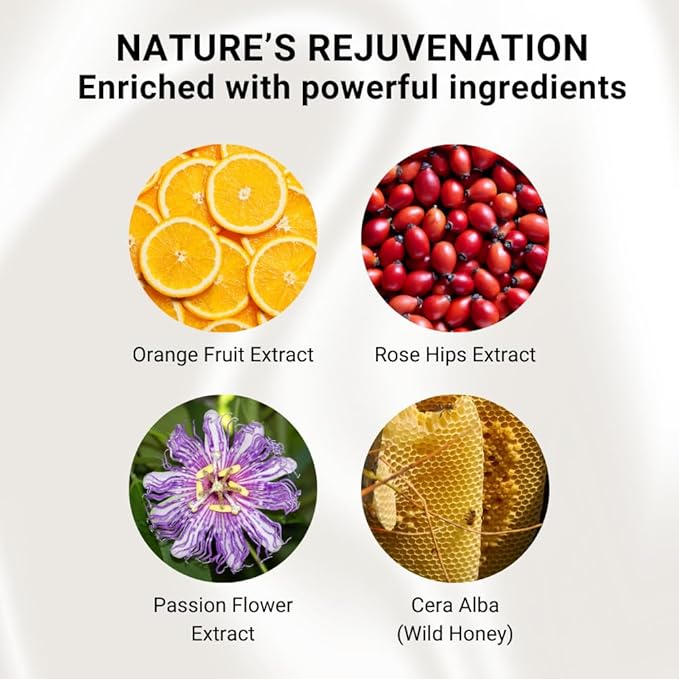 - SKIN-LOVING INGREDIENTS Enriched with powerful extracts like orange fruit, rose hips, passion flower, and wild honey, our cleanser is more than just a makeup remover. Packed with essential vitamins and antioxidants, it nourishes your skin, promotes collagen production, helps smooth fine lines and wrinkles, and calms redness for a smoother, firmer complexion.