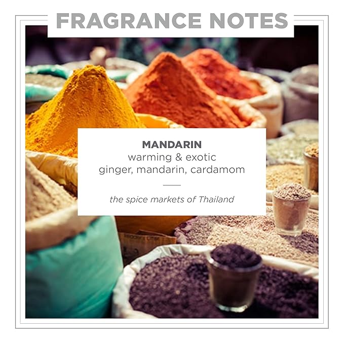 - WARMING & EXOTIC. Inspired by a stroll through the spice markets of the East, this scent features exotic base notes of freshly ground ginger, nutmeg and cardamom while floral-fruity mandarin, creamy vanilla bean and Saffron deliver well-rounded warmth.