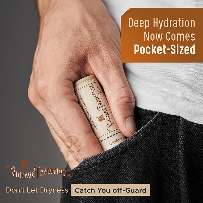 - Max Moisture – Chapped lips are a pain in the mouth. Kiss dry lips goodbye with your Vintage Tradition’s lip salve tube featuring nourishing tallow balm, olive oil, and essential oils.