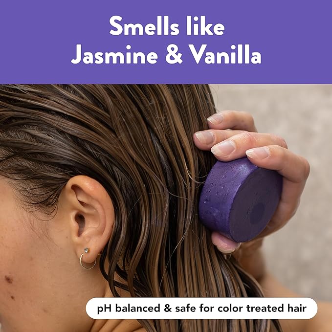 - Nourishing Ingredients: Brightening purple pigments and a dash of beetroot powder give this solid conditioner toning superpowers, while the addition of cocoa butter and babassu oil nourish and add lightweight shine.