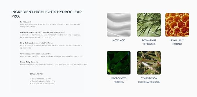 - π Smart Ingredient Blend β HydroClear Pro features lactic acid and glutamic acid to gently refine the look of skin texture and support a smoother appearance. Infused with rosemary and kelp extracts, this professional formula helps soothe, refresh, and balance the skin after treatments. Suitable for all skin types, it promotes a healthy, rejuvenated look.