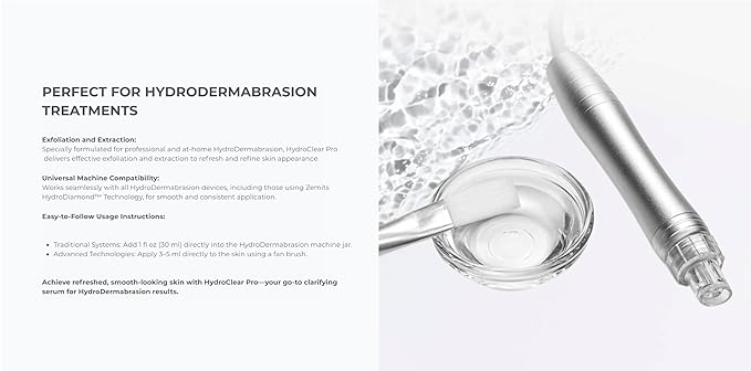 - πΊπΈ Proudly Made in the USA β HydroClear Pro clarifying serum is designed for use with diamond microdermabrasion, skin scrubber exfoliation, or as a peeling essence in multi-step facial protocols. Trusted by estheticians, this professional formula also fits seamlessly into advanced at-home skincare routines, helping support a refreshed, healthy-looking complexion.