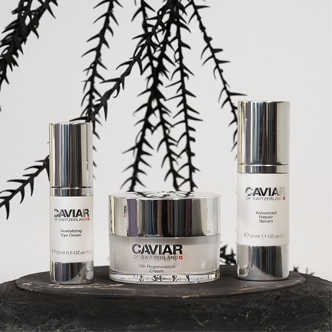 - โ ๐๐ฎ๐ฑ๐ฎ๐ซ๐ฒ ๐๐ง๐ญ๐ข-๐๐ ๐ข๐ง๐ ๐๐ซ๐ข๐จ ๐๐จ๐ซ ๐๐๐๐ข๐๐ง๐ญ ๐๐ค๐ข๐ง: Elevate your skincare routine with Caviar of Switzerland's Advanced Repair Serum, Revitalizing Eye Cream, and 24H Regeneration Cream. The Advanced Repair Serum is a rich, concentrated formula that nourishes aging skin. The Revitalizing Eye Cream, infused with luxurious Caviar, regenerates and revitalizes the delicate eye area. The 24H Regeneration Cream provides long-lasting hydration and anti-aging benefits, revealing your skin's natural glow day and night.