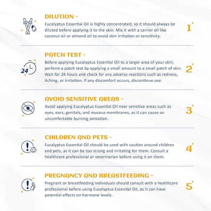 - Body Massage: Mix 1 drop of eucalyptus essential oil with 10 drops of carrier oil (sweet almond, grapeseed or jojoba). Take an appropriate amount of the blended oil in your palm and apply it in a circular motion on the body parts