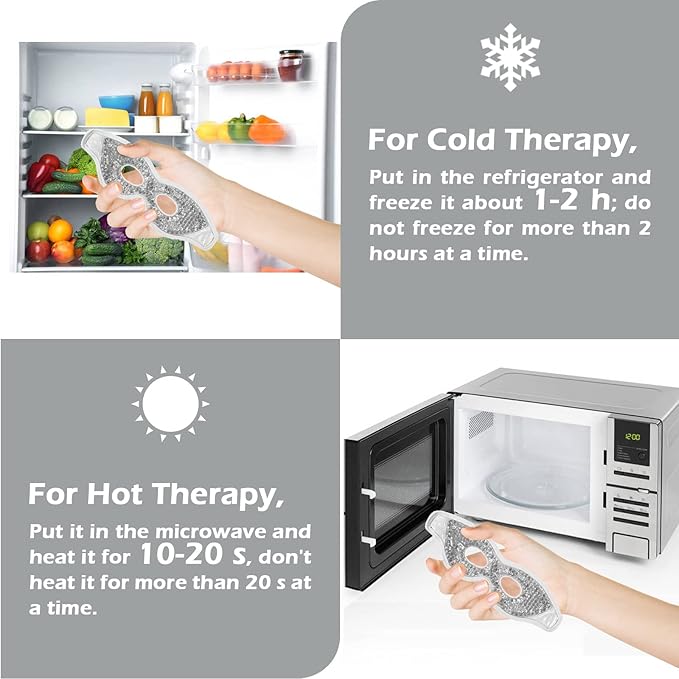- ๐Hot&Cold Therapy: Using the principle of physical therapy, wear the gel eye mask after cooling or heating for 8-15min to help you relieve fatigue and stress. For cold therapy,place it in the refrigerator for about 1-2h; for heat therapy, place it in a microwave oven and heat it for 10-20s.