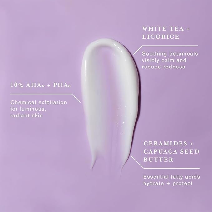 - FEATURED INGREDIENTS: Glycolic + Lactic Acids β Potent AHAs that exfoliate for smoother, softer skin. Ceramides β Prevent moisture loss and support a healthy skin barrier. Urea β Draws moisture from the air to hydrate skin. Gluconolactone β PHA that exfoliates, hydrates, and offers anti-aging benefits. Lactobionic Acid β A gentle PHA for hydration and exfoliation. Squalane β Restores and hydrates. Cupuacu Seed Butter β Moisturizes and protects with polyphenols. Anti-Redness Complex β Reduces redness and calms skin. Willow Bark β Exfoliates deeply as a natural BHA.