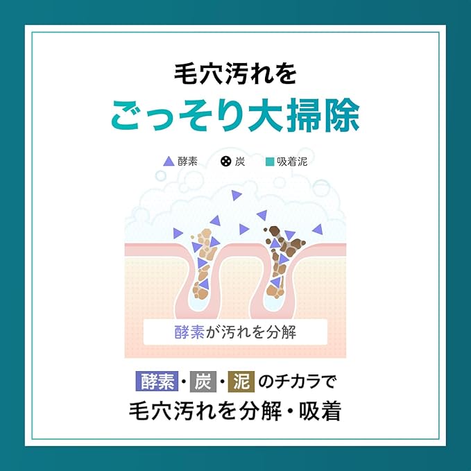- Removes dirt, blackheads, and keratin plugs from pores with enzymes, charcoal, and adsorption mud. Formulated with hyaluronic acid and amino acid-based cleansing ingredients, it removes dirt and grime while protecting the skin's natural moisture, leaving it smooth and clear. Rich and elastic foam
