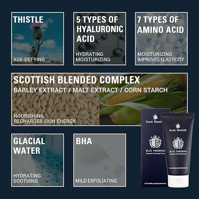 - POWERFUL MEN CARE FORMULA: Scott Hamish Blue Freedom Capsule Cleansing Foam is power-packed formula enriched with blue energy that transforms men's dull and tired-looking skin into soft & rejuvenated. Use this exfoliating face wash men to eliminate breakouts & acne without stripping your skin of moisture.