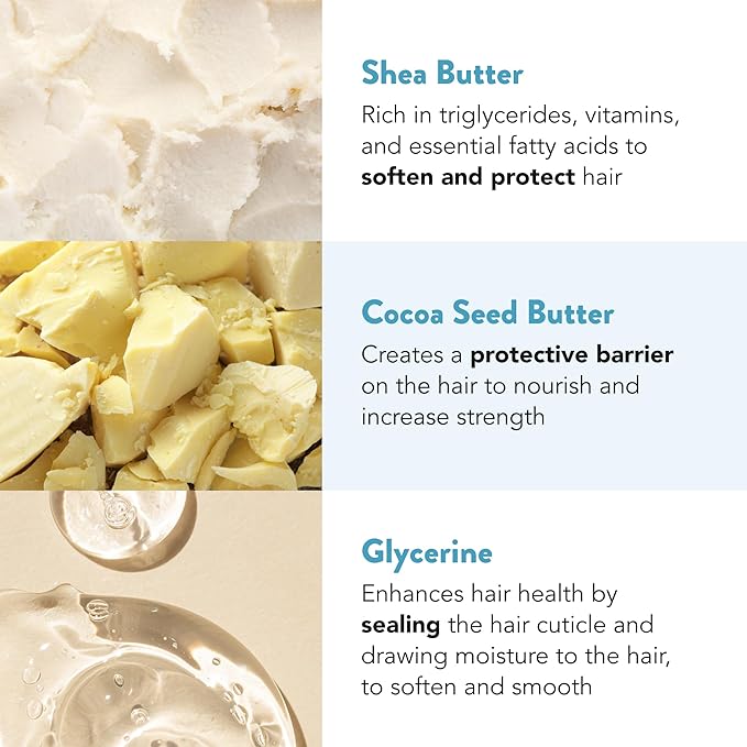 - Nourishing Ingredients: Shea butter, betaine (from sugar beets), and cocoa butter for softer hair and defined curls. No sulfates, silicones, drying alcohols, or waxes!