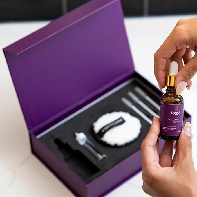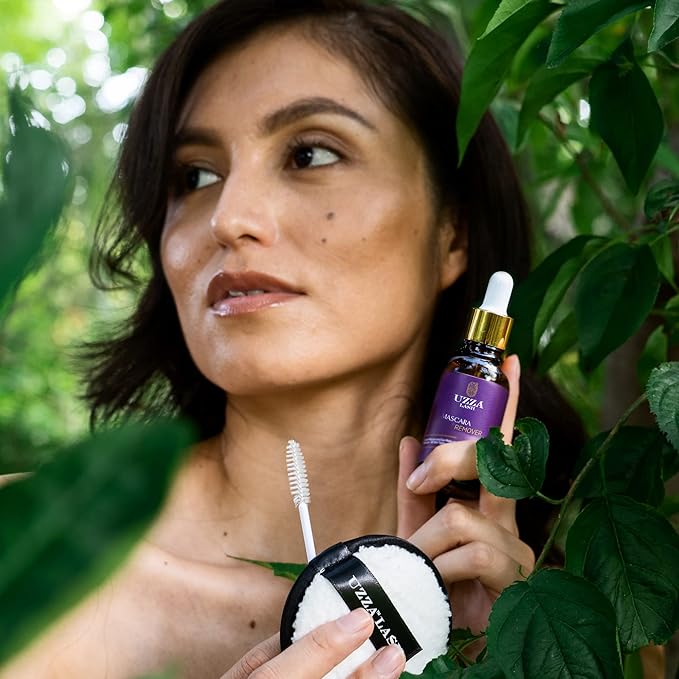 UZZA Lash Eye Makeup Remover - Waterproof Mascara Remover for Sensitive Eyes - Natural Make up Remover - Hygienic Kit Includes Eyelash Brush, Reusable Pads, Cleanser Liquid 1oz