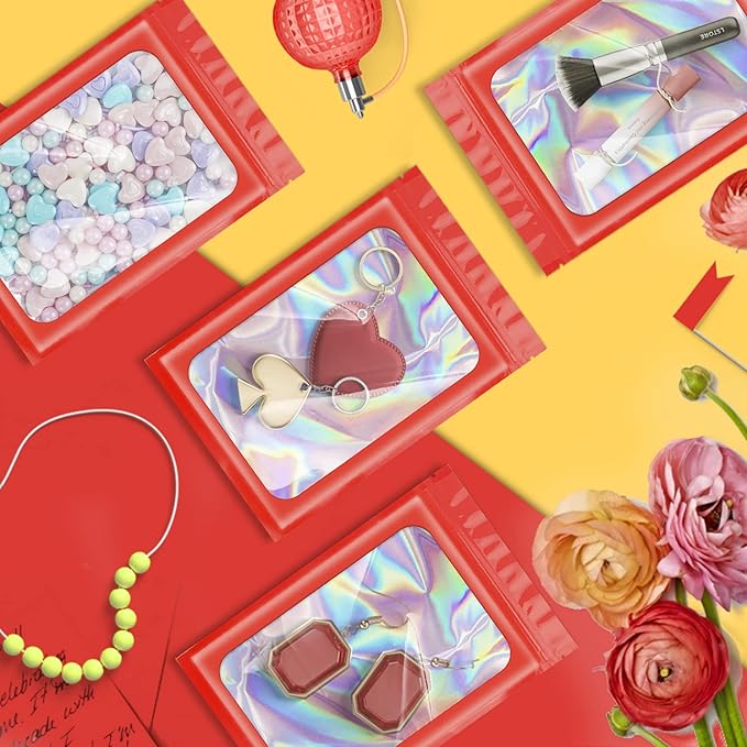 100 Pieces Smell Proof Mylar Resealable Bags, Holographic Packaging Bags, Resealable Odor Foil Pouch Zip Bag with Clear Window for Food Storage and Lipgloss, Jewelry Lash (Red, 3.5 x 6.3 Inch)