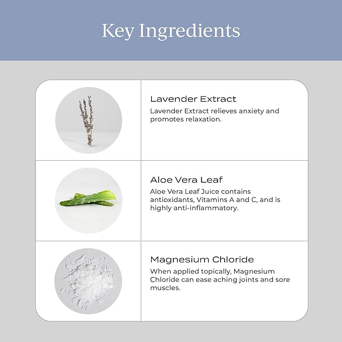 - PLANT BASED INGREDIENTS: Our magnesium body spray is crafted with pure plant based ingredients which can provide multiple health benefits. Included in our formula is lavender extract known for its calming properties, and aloe vera leaf juice which is enriched with antioxidants as well as vitamins A and C which can support overall well-being.
