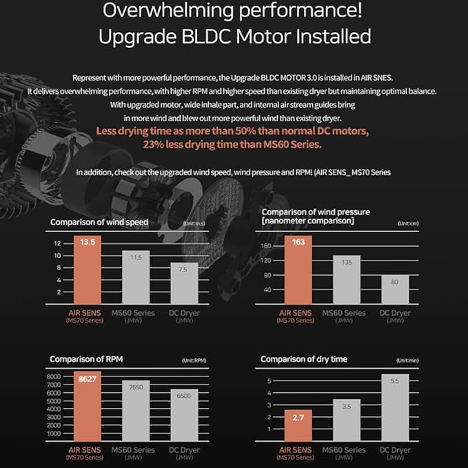 - [POWERFUL WIND with UPGRADE BLDC MOTOR 3.0] - The BLDC motor is a brushless motor that extends the life of the dryer more than 10 times. It not only lowers vibration but improves energy efficiency by more than 20%. The upgraded motor, wide inhale part, and internal air stream guide brought in more wind and blew out more powerful wind than the existing dryer.