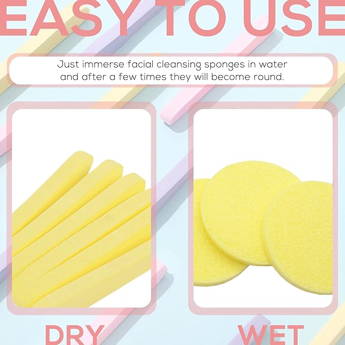 - Package Includes:You will get 120 pcs pad exfoliating wash round face sponges in 3 bright colors,pink,yellow and purple.Each color of compressed sponge has 40 pieces.
