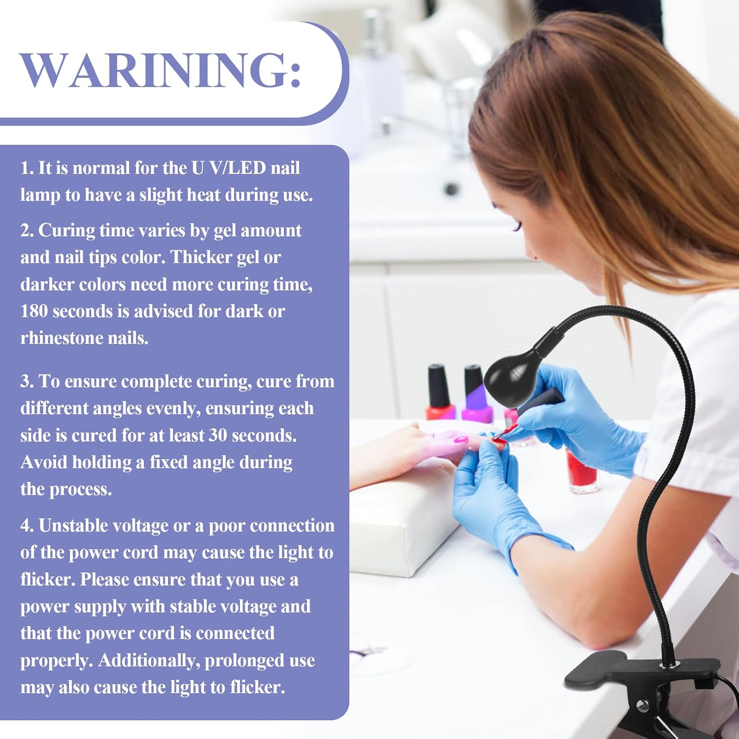 - Tips: Put it near the 3W U V LED light for about 3cm and 120s of gel nail polish for a full cure. And avoid overly constant use for overheat. Make sure the wire is fully extended when the light starts to fickle. Premium quality USB power supply is very convenient to get to charge everywhere