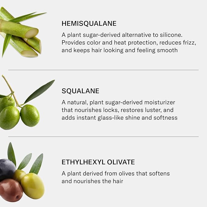 - Hero Ingredients: Hemisqualane β a plant sugar-derived alternative to silicone that reduces frizz and keeps hair looking and feeling smooth. Squalane: A natural, plant sugar-derived moisturizer that nourishes locks, restores luster, and adds instant glass-like shine and softness. Ethylhexyl Olivate: A plant derived from olives that softens and nourishes the hair