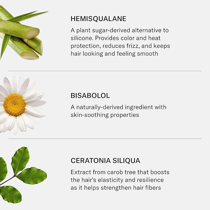 - Hero Ingredients: Hemisqualane β A plant sugar-derived silicone alternative that protects against color fading and heat, reduces frizz, and smooths hair. Bisabolol β A naturally derived ingredient with soothing benefits. Ceratonia Siliqua β Carob tree extract that boosts elasticity and strengthens hair. Moringa Oleifera β Horseradish tree extract that shields hair from pollution and UV rays. Squalane β A plant-based moisturizer that nourishes, restores shine, and adds softness.