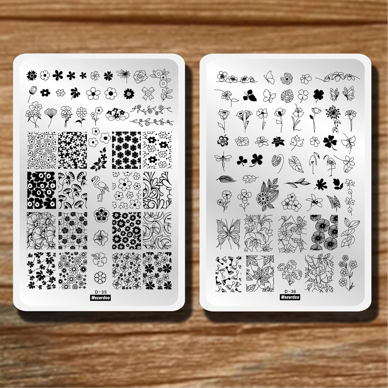 - PACKAGE CONTENTS: 2 Pcs Large Nail Art Stamp Template Image Plate Set, Line, Flower, Maple, Palm Leaf, Leaves, Butterfly, Flamingo, Daisy, Footprint, Four-leaf Clover, Animals Plant Patterns. Notice: The Stamp And Scraper Are Not Included