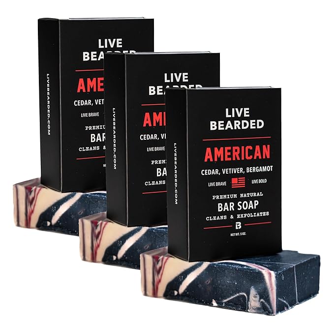 Live Bearded All-Natural Bar Soap for Men, 3-Pack of 5 oz - Made in the USA - Exfoliates and Moisturizes - Charcoal, Pumice, Shea Butter | American Scent - Cedar, Vetiver, Bergamot