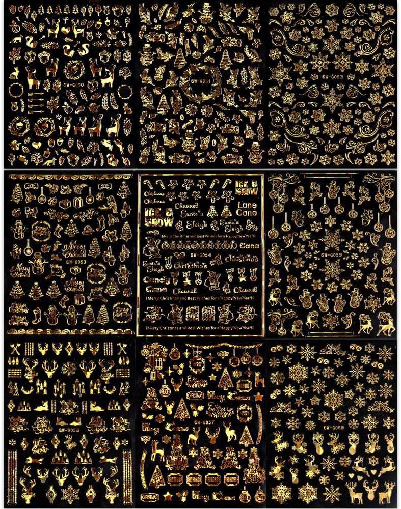 9 Sheets Christmas Nail Art Stickers Decals Self-Adhesive Pegatinas Uñas Holiday Glod Laser Snowflakes Snowman Nail Supplies Nail Art Design Decoration Accessories