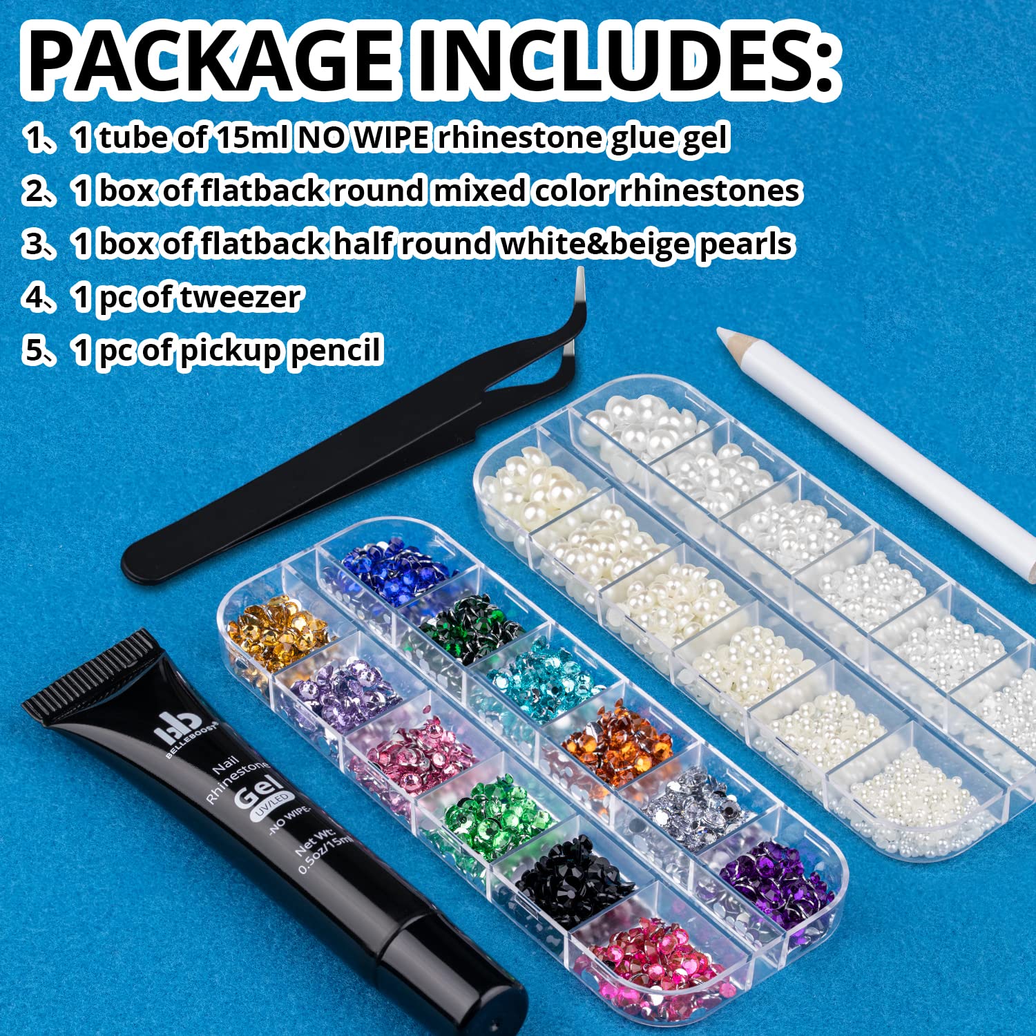 - đź’ŽWHAT YOU WILL RECEIVE: This package contains 1 pc of 15ml tube design NO WIPE rhinestone gel glue; 1 box of flat back round mixed color rhinestones; 1 box of white&beige half round pearls; 1 pc of picker pencil and 1 pc of tweezer. This set helps you decorate your nails more conveniently.