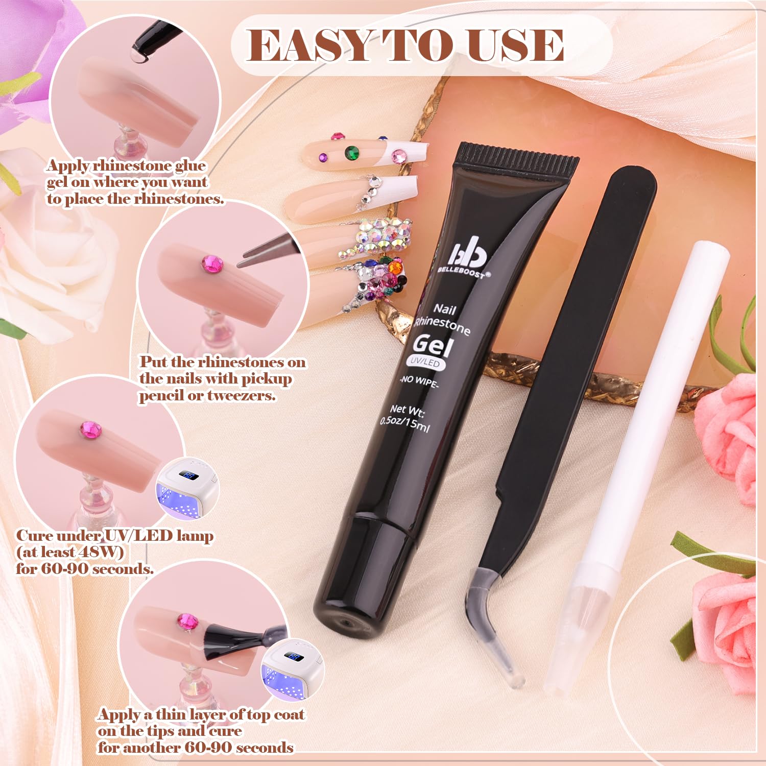- WHAT YOU WILL RECEIVE: This package contains 1 pc of 15ml tube design NO WIPE rhinestone gel glue; 1 box of flat back round mixed color rhinestones; 1 box of flat back round crystal AB&transparent white Gem Beads; 1 pc of picker pencil and 1 pc of tweezer. This set helps you decorate your nails more conveniently.