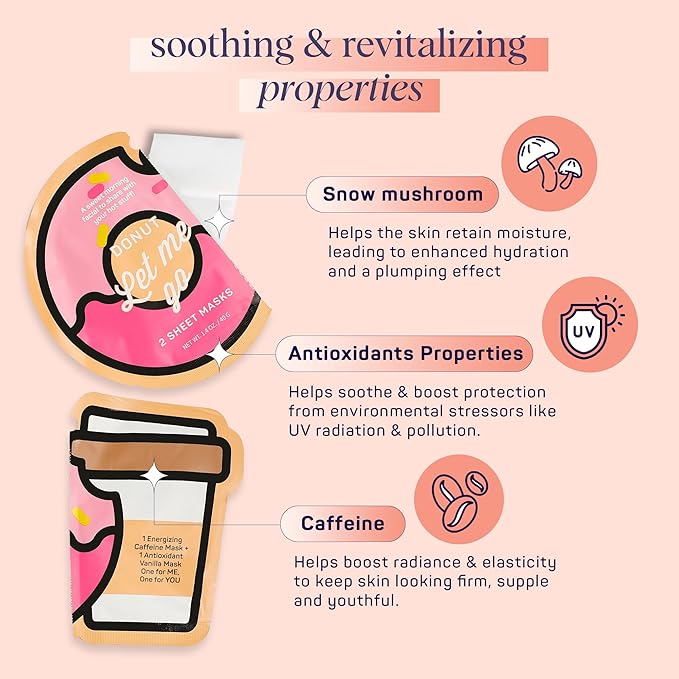 SpaLife Donut Let Me Go Duo Facial Masks - Pack of 6 - Skincare Gift Set for Valentine's Day - Radiant Caffeine and Soothing Vanilla - Beauty Moisture Hydration Face Mask for Men and Women