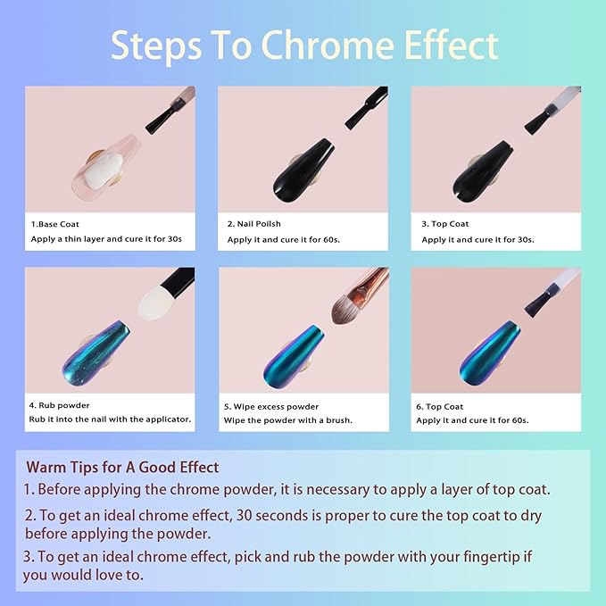 - Easy to Use: It is easy for chrome powder to make beautiful chrome effects. You easily get salon-quality results. Just need some gel, some nail top coat, and chameleon powder. To make it easy to use the powder, we provide detailed steps in the images.