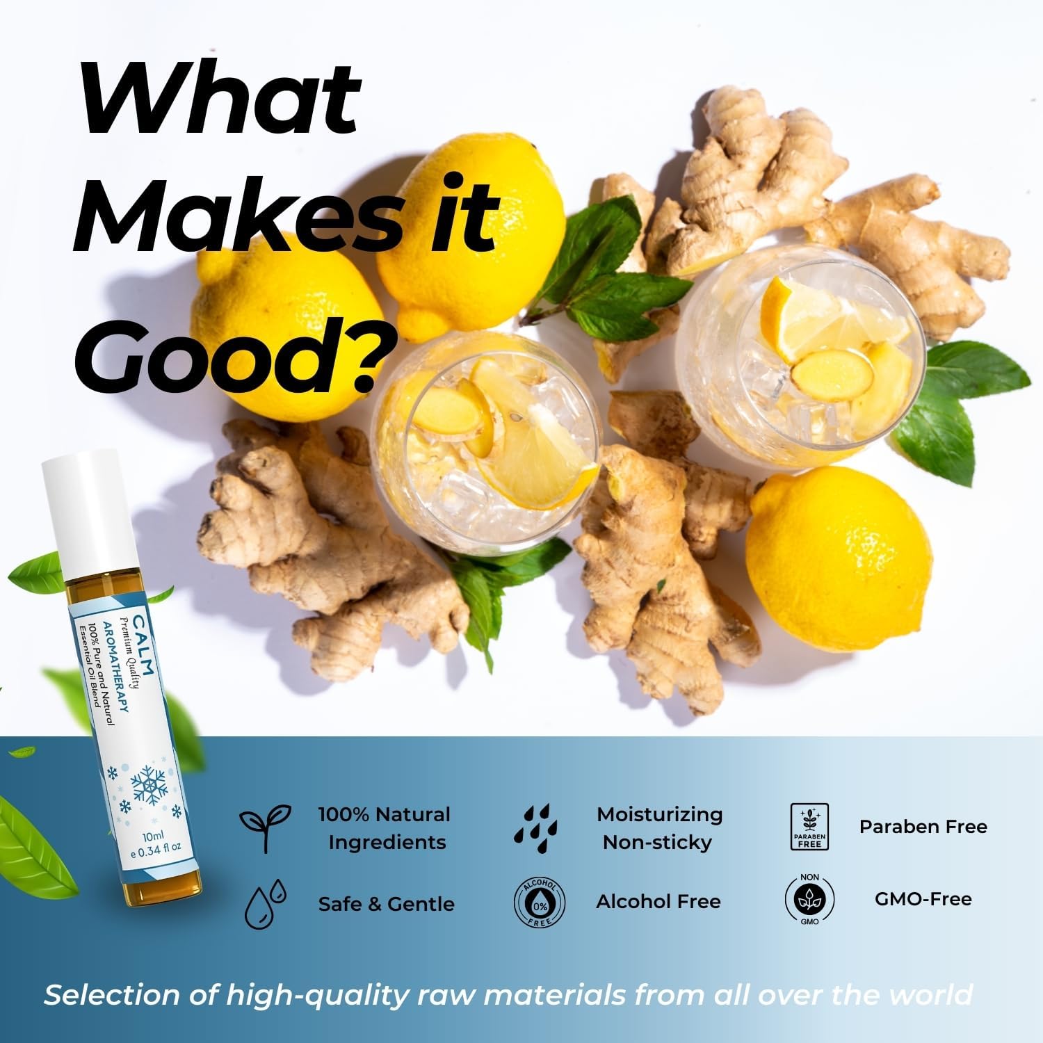 Benatu Calm Essential Oil Roll On Blend (with Ginger, Patchouli, Lemon Oil), Travel Size Relaxing Roller for Body Topical Massage, Natural Scent Aromatherapy Gift for Women & Men 10ml