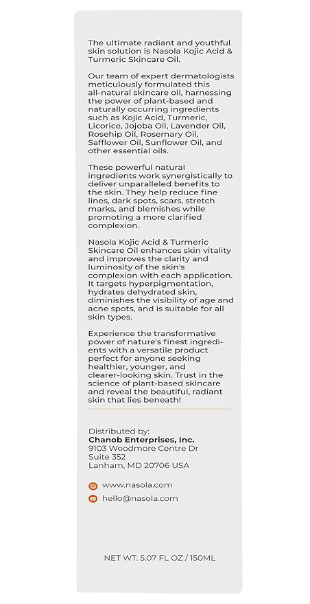 - Natural Potency for All Skin Types: Crafted with a unique blend of Rosemary Oil, Safflower Oil, and Sunflower Oil, Nasola Kojic Acid Turmeric Skincare Bio Pure Oil promises care that's gentle yet effective. Safe for face and body application, this Turmeric Oil for body and face caters to all skin types, ensuring everyone can experience its remarkable benefits.