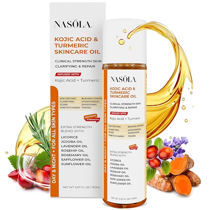 - Clinical Strength Clarifying & Repair: Infused with a potent blend of Kojic Acid, Turmeric, and Licorice, the Nasola Kojic Acid Turmeric Skincare Bio Pure Oil is expertly formulated to reduce skin discoloration, sun-induced marks, blemishes, and other complexion inconsistencies, revealing a radiant and luminous glow. Witness a transformation as this oil actively fights against acne, scars, and stretch marks, offering a more youthful and radiant appearance.