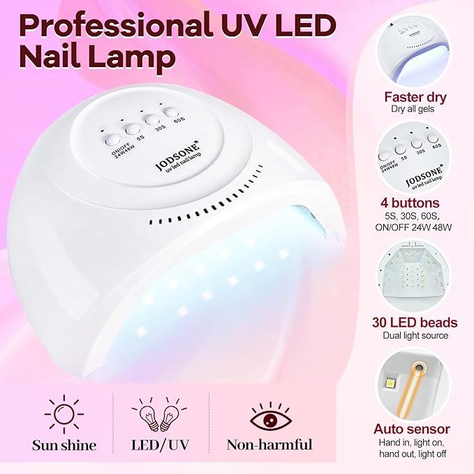 - Smart Nail Lamp: The nail lamp material is lightweight and has 3 curing modes; 5 seconds, 30 seconds, 60 seconds. It contains 30 small led light beads that can cure gel nail polish in all directions. With the cure of the nail lamp and proper handling, it lasts about 21 days.