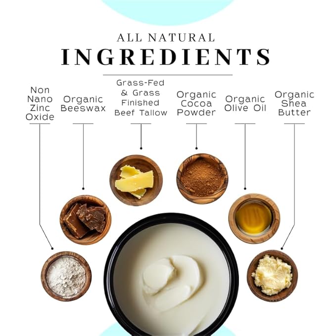 - Skin Loving Ingredients - This zinc sunscreen absorbs quickly and uses pure ingredients; packed with non-nano minerals, grass fed beef tallow, olive oil, beeswax, shea butter, and cocoa powder, it nourishes while caring for your skin