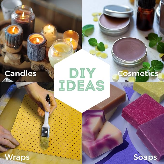 - ๐[Versatile Usage] Beewax has a wide range of uses, including being used as a natural food preservative as food grade beeswax, and as a primary ingredient in beewax candle making due to its clean-burning properties, projects such as making body butters, lip balms, face lotions, beeswax wraps, candles, furniture polish, soap making, crayons and so much more.