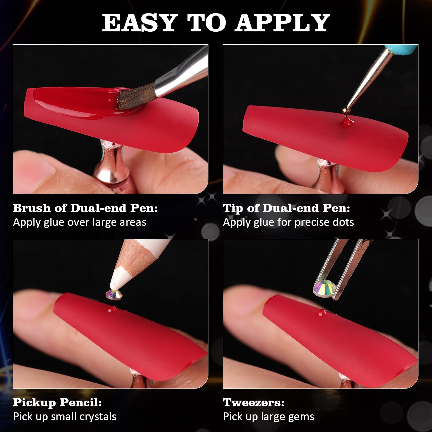 - đź’ŽMULTIFUNCTIONAL TOOLS: The wide-head brush end of the dual-end dotting tool makes it easy to apply a large amount of your nail polish to the nail surface at once, while the other mini dotting end is great for detailed drawing. Picker pen can help you handily pick up small nail stones, while tweezer is a better choice for big beads. The flatback gems are not self-adhesive and glue-needed. (glue is not included.)