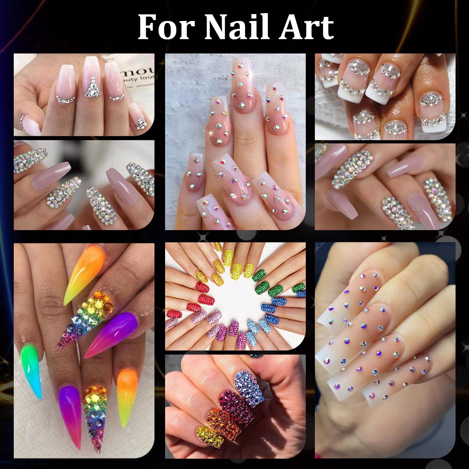 - đź’ŽSPARKLING BRILLIANCE FOR ALL: The dazzling nail stones can decorate natural or acrylic nails, suitable for nail art beginners, hobbyists, nail tech, and professional manicure salons. We offer a wide size range, from 2mm to 5mm, that is perfect for your DIY nail art projects. You can get creative nail art shapes and patterns by mixing sizes and colors. Besides, the gems can be also used for eye or face makeup and crafting, such as bedazzling clothes, shoes, tumblers, and cards.