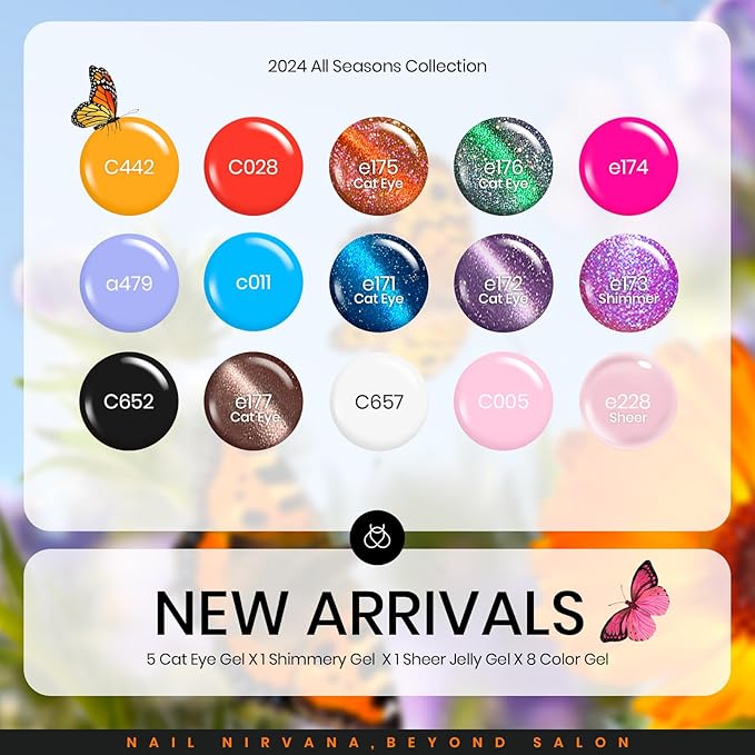 - 【What You Get】15 x Mini Gel Polish Colors (0.17oz/5ml each bottle) + 3 x No Wipe Base and Glossy & Matte Top Coat (0.25oz/7.5ml each bottle)+Color card*24 pcs+Medium Almond& Medium Coffin false nail tips*60 pcs+Double-headed magnet*1+Silicone mold kit*1+Tweezers*1+ Nail Art Jelly Strips*5+Paper card*1. 15 beautiful shades of popular and trendy colors suitable for all seasons and daily routine life! Color Numbers are: c442-c028-e175-e176-e174-a479-c011-e171-e172-e173-c652-e177-c657-c005-e228.