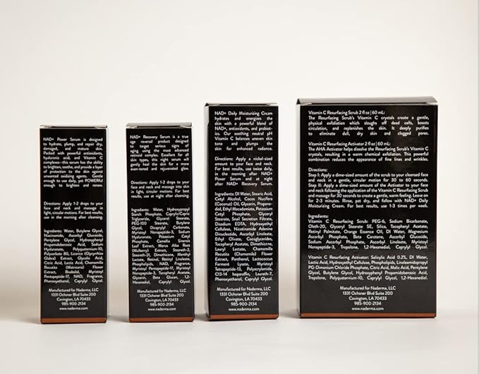 Naderma Set (NAD+ Daily Moisturizing Cream, NAD+ Power Serum, NAD+ Recovery Serum, and Vitamin C Resurfacing Scrub + Activator))