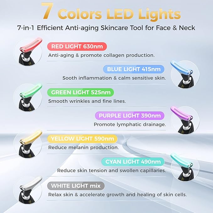 - [7-in-1 Multifunctional Massager] This face neck massager has 7 different LED light modes that are not only suitable for massaging the face, neck but also can be used to massage the arms, shoulders and other body parts, tightening the sagging skin and relaxing the muscles.