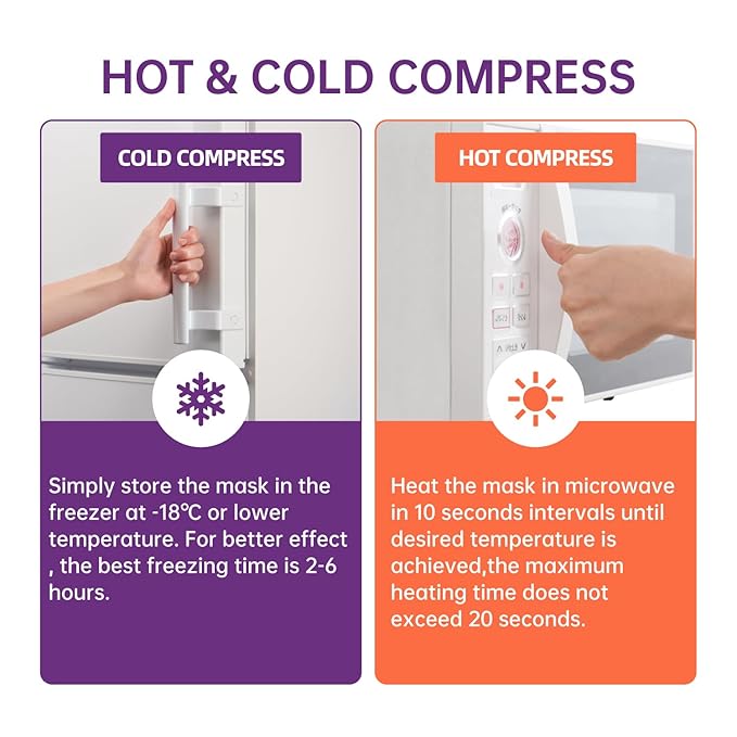 - Cold & Hot Compress: Gel face mask cold pack fills with medical grade gel beads with good temperature storage, it can be used as a hot or cold compress. For better results, when used cold, the best freezing time in the refrigerator is 2-6 hours. Or heat in microwave oven for 10 seconds to achieve the heat therapy effect.