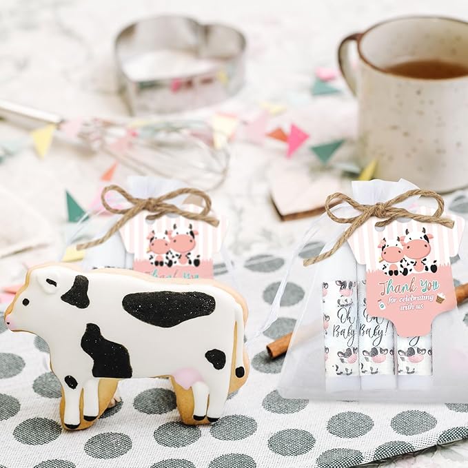 Demissle 50 Pcs Baby Shower Lip Balm Gift Set with 100 Pcs Organza Bags Baby Shower Party Favor for Guest Thank You Tag Rope Baby Shower Party Decoration Gender Reveal Souvenirs(Cow)