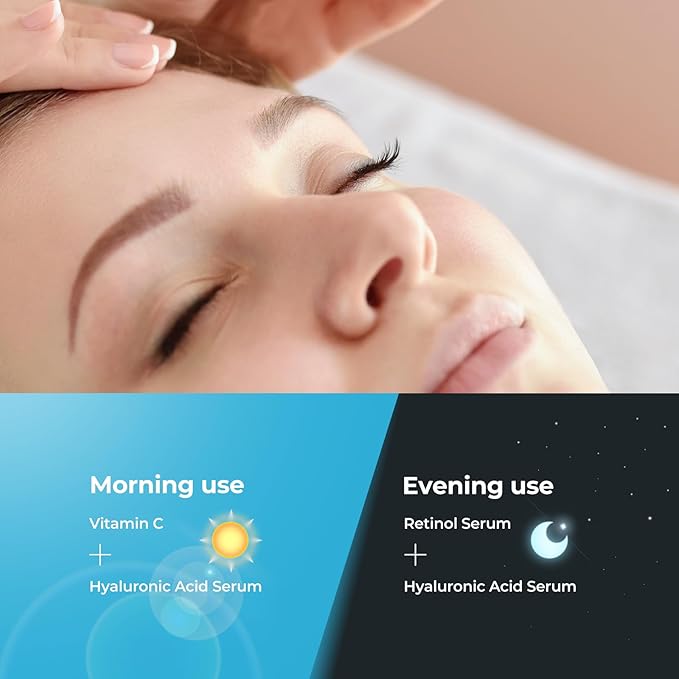 - HOW TO USE: Apply Vitamin C Serum for face in the morning, followed by Hyaluronic Acid Serum. Apply Retinol Serum in the evening, followed by Hyaluronic Acid Serum. Apply 3-5 drops of serum every morning and evening when cleansing skin; for best results, follow with moisturizer. Important Tip: Apply sunscreen daily when using retinol in a skincare routine.