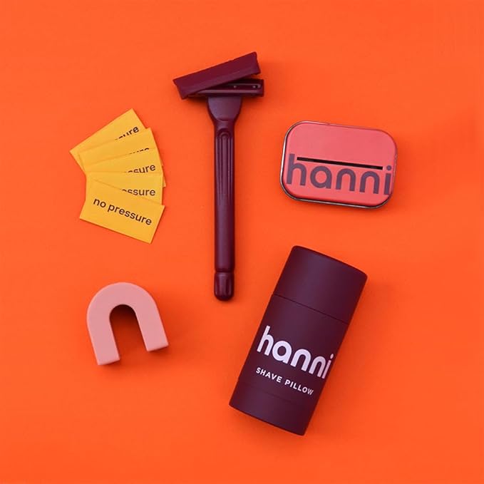 - SHOWER ESSENTIAL: The HANNI Shave Starter Set has everything you need to ditch plastic and upgrade your shave. Includes a weighted razor, Shave Pillow gel, 5 blades, blade bin, and chic Hero Holder.