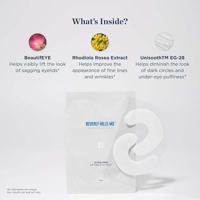 - LIFT, SMOOTH, CORRECT: Beverly Hills MD Ultra Firm Lifting Eye Mask is an advanced full-spectrum topical patch that combines crease-fighting ingredients, and a powerful “lifting” complex to help you correct the look of crow’s feet, thinning skin, under-eye bags, and drooping eyelids all at once.*