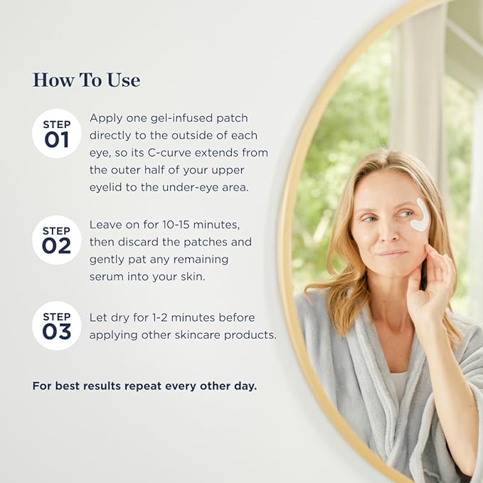 - HOW TO USE: Apply one gel-infused patch directly to the outside of each eye, so its C-curve extends from the outer half of your upper eyelid to the under-eye area. Leave on for 10-15 minutes, then discard the patches and gently pat any remaining serum into your skin. Let dry for 1-2 minutes before applying other skincare products. For best results repeat every other day.
