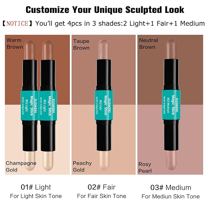 - 【Sculpted 3D Face Makeup Look Made Easy】 SUSIKEKI highlighting & contouring duo stick shade, brighten, shape and blend like a magic! 【HOW TO USE】Swipe the deeper end to shape and sculpt, then apply the lighter shimmery end to brighten and highlight. Use your finger pulps, beauty blender or contour brush to gently dab(do not pull hardly) the product and easily blend them well for a natural gorgeous finish! Customize your makeup look with these super buildable shades!