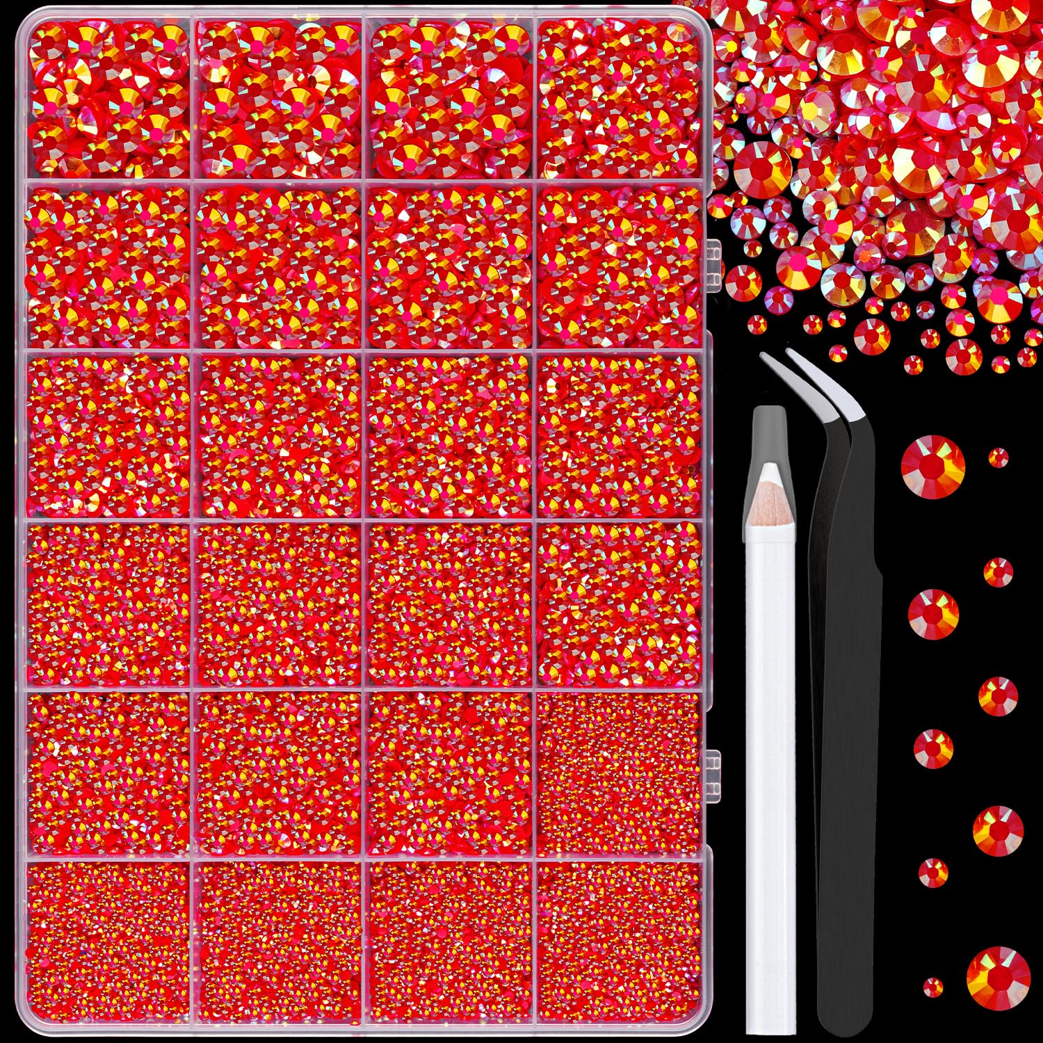 - ๐PACKAGE CONTENT -- The package includes 1 box with 24 grids, featuring a variety of sizes: 2mm x 5 grid, 3mm x 6 grid, 4mm x 5 grids, 5mm x 5 grids, and 6mm x 3 grids, approx. 25000 pcs of 2-6mm bling-out resin rhinestones (Red AB). 1 tweezers and 1 pickup pen are included for easily picking up of rhinestones. The large amount will support you to fulfill a number of your wonderful DIY decoration ideas.
