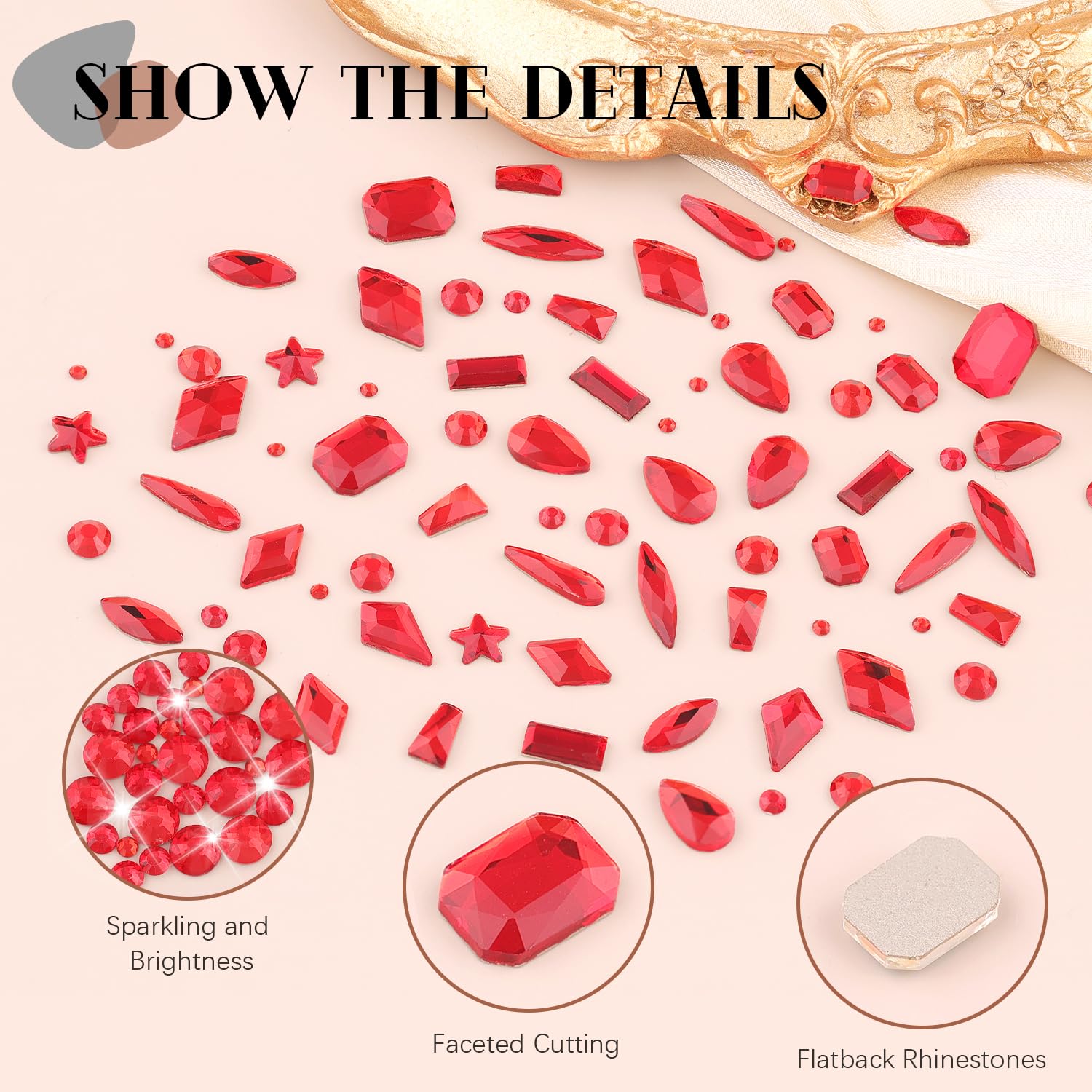 - ๐PACKAGE CONTENT -- The package contains 120Pcs multi shapes flatback gems crystal and 3100Pcs 1.5-4mm round beads, totally 3220Pcs Red rhinestones. Additionally, 1 tweezers for large size gems and 1 pickup pen for small size gems. 1 15ml rhinestones glue gel for nail design. This rhinestones kit makes it easy for you to make any nail art you like, and will bedazzle your acrylic nails!