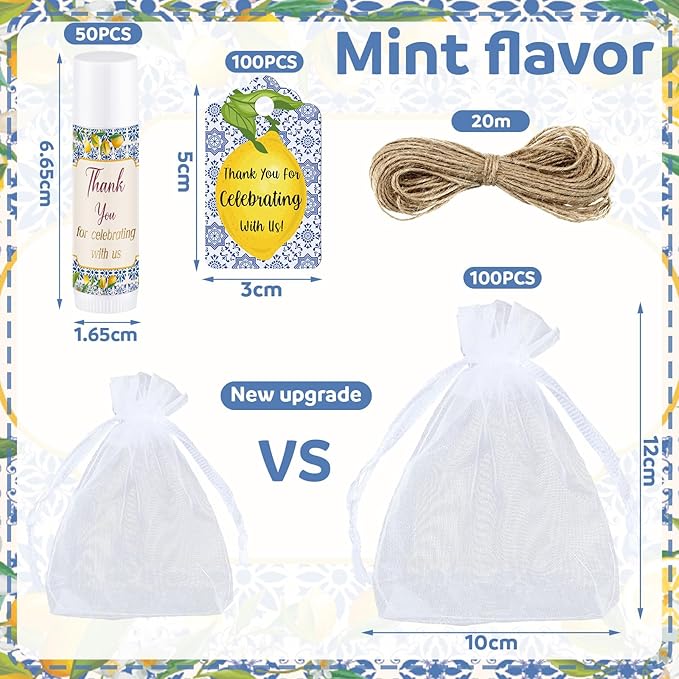 - Nice Lip Balm Combination: the package includes 50 pieces of mint flavor lip balms with 100 thank you tags, 20 meter long cord, and 100 pieces of white transparent organza gauze bag, the sufficient quantity is enough for the wedding supplies, baby shower favors and bridal shower favors