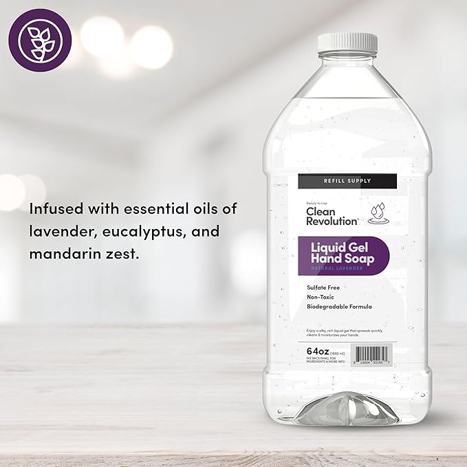Clean Revolution Liquid Gel Hand Soap, Silky Rich Liquid, Quick Lather, Fast Rinsing, Contains Real Essential Oils (Natural Lavender) 64 Fl Oz